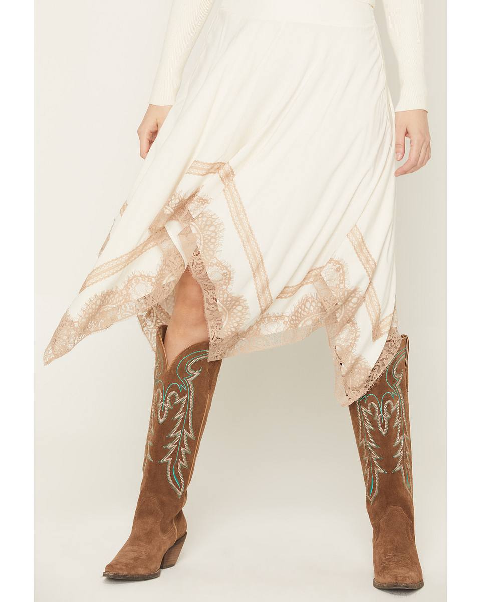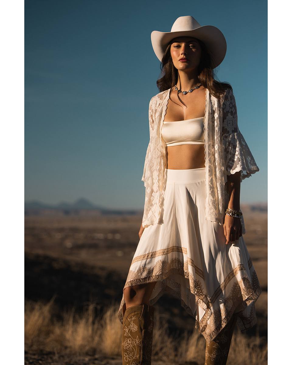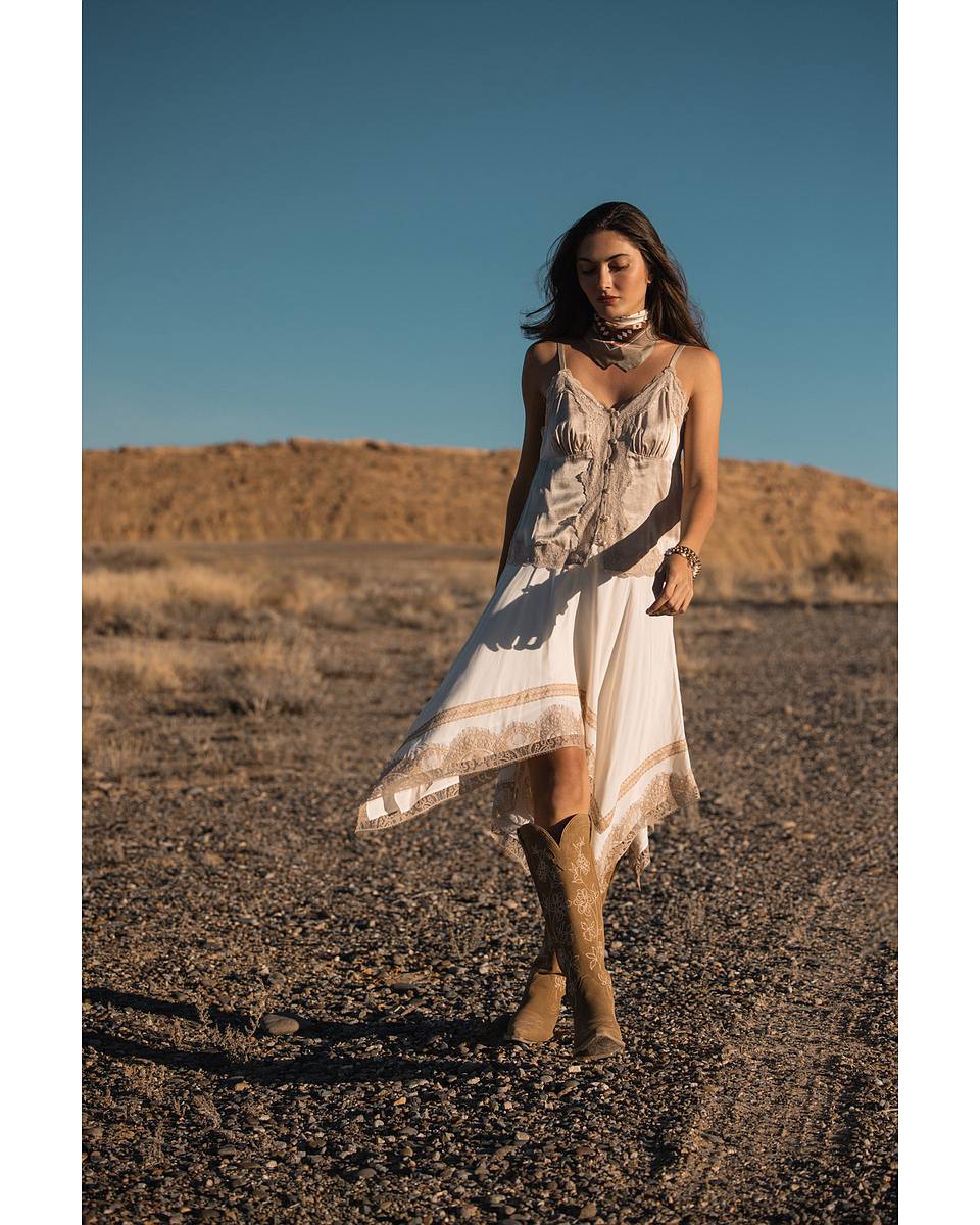 • Light brown lace trim with frayed edges
